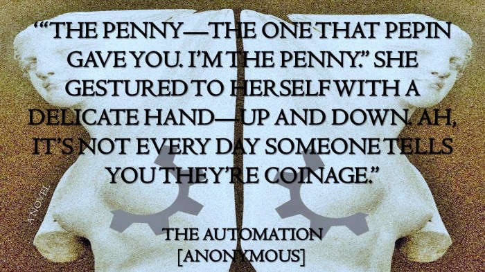 “The penny—the one that Pepin gave you. I’m the penny.” She gestured to herself with her delicate hand—up and down. Ah, it’s not every day someone tells you they’re coinage. “Your cat tried to eat me, back there. Frisky little thing doesn’t know how to it play cool. I swear, I’ve nothing against cats, as long as they don’t swallow. I’ve been swallowed before—by a dog, see. Not a very pretty way to pass the time, I tell you. Can’t turn humanoid in a dog, no. Not unless you want the damn animal to explode.”